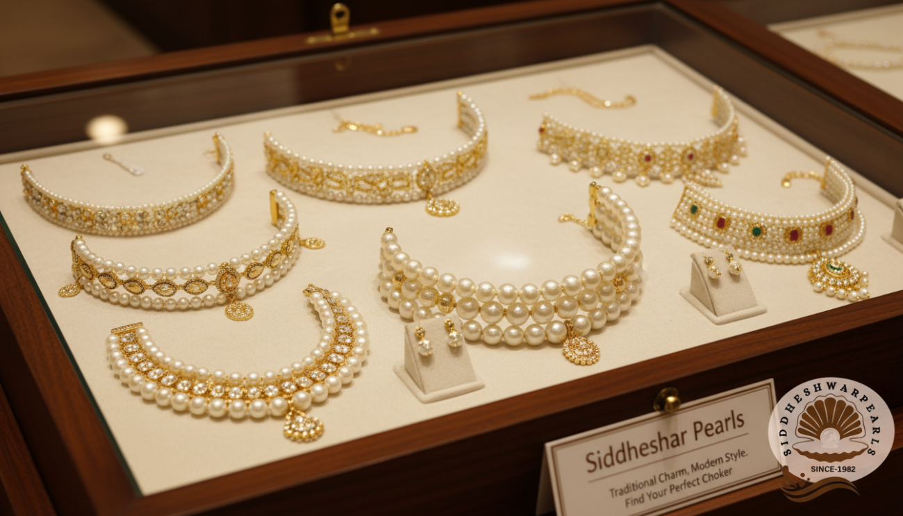 stunning collection of pearl chokers, including elegant pearl choker necklace gold, timeless gold pearl choker necklace, and beautifully crafted moti choker set designs. These chokers combine traditional charm with modern style, making them perfect for weddings, festivals, and special occasions. Explore the full range of pearl jewellery and find the perfect choker that matches your taste and budget on Siddheshwar Pearls.