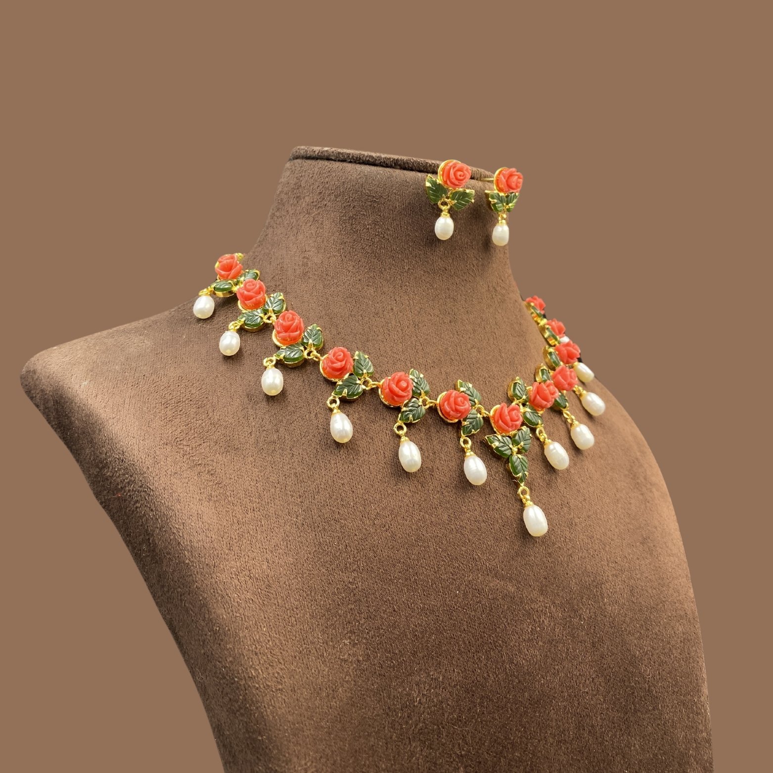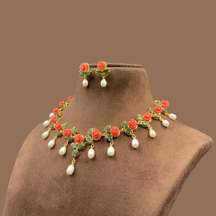 An exquisite fusion of elegance and color the Pearl with Coral and Jade Necklace blends timeless pearls with vibrant coral and serene jade for a truly captivating look